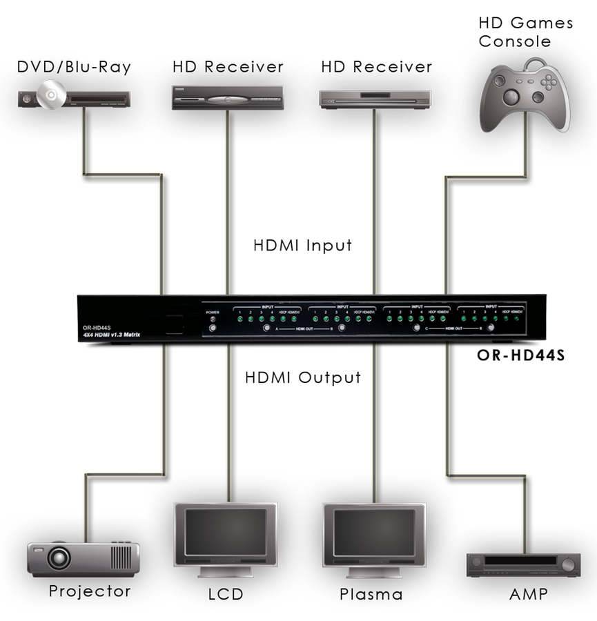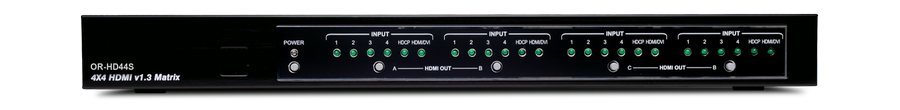 OR-HD44S — матричный коммутатор 4×4 для сигналов HDMI 1.3, специально разработан для передачи HDMI сигналов в системе с несколькими источниками и приемниками сигнала. Каждый сигнал, поданный на любой вход, может быть произвольно направлен на один или несколько выходов коммутатора, таким образом, несколько дисплеев, подключенные к данному устройству, могут одновременно отображать одинаковое или разное изображение. При прохождении HDMI сигнала через устройство, происходит компенсация уровня, коррекция фазы, восстановление тактовой частоты, таким образом достигается возможность передачи сигнала еще до 25 метров с последующим каскадированием.