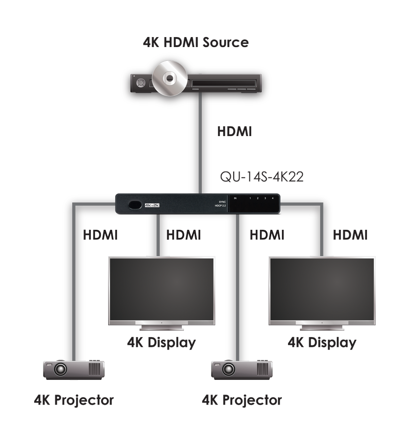 QU-14S-4K22 – усилитель-распределитель 1:4 сигналов HDMI разрешений до 4K x 2K. Распределяет входной сигнал, полученный от одного источника, на четыре или два выхода HDMI одновременно, при этом обеспечивая передачу данных со скоростью до 9 Гбит/с без искажений и потерь. Соответствует требованиям спецификации HDCP 2.2, поддерживает сигналы с 3D и DeepColor, форматы многоканального аудио. Имеется возможность выбора источника данных EDID, регулировка с помощью удобного переключателя на корпусе устройства. Прибор оборудован сервисным разъемом USB для обновления микропрограммы.